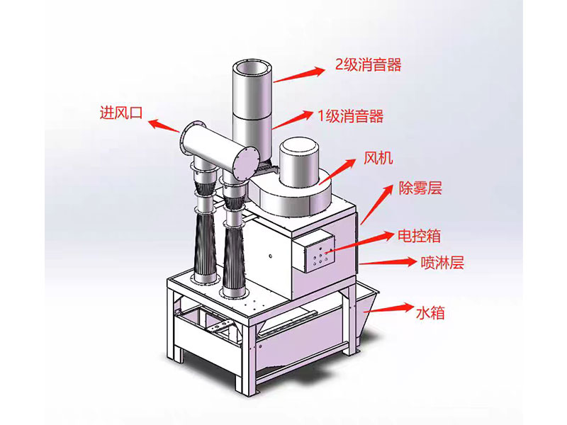 排出至本系统的预排尘箱。余下含有细颗粒的空气进入正式水雾除尘的后续处理,